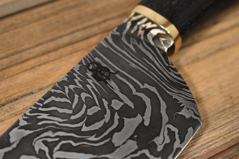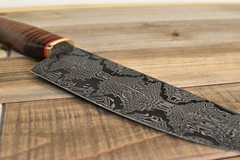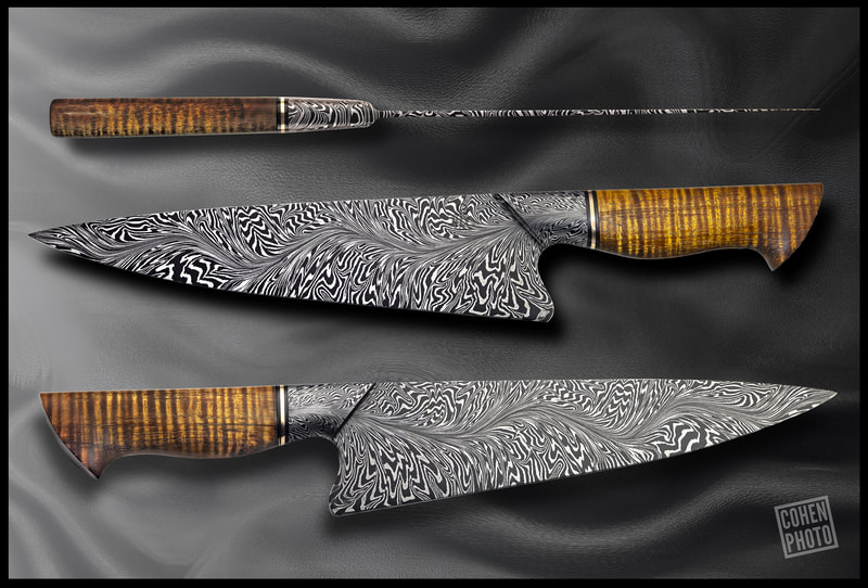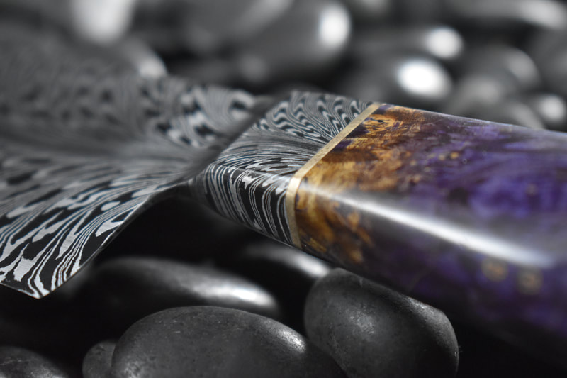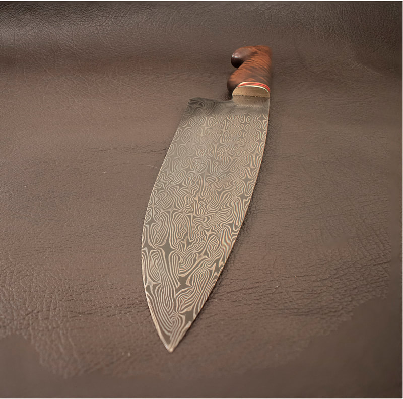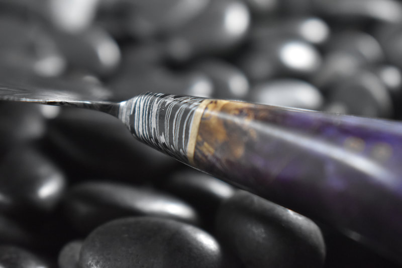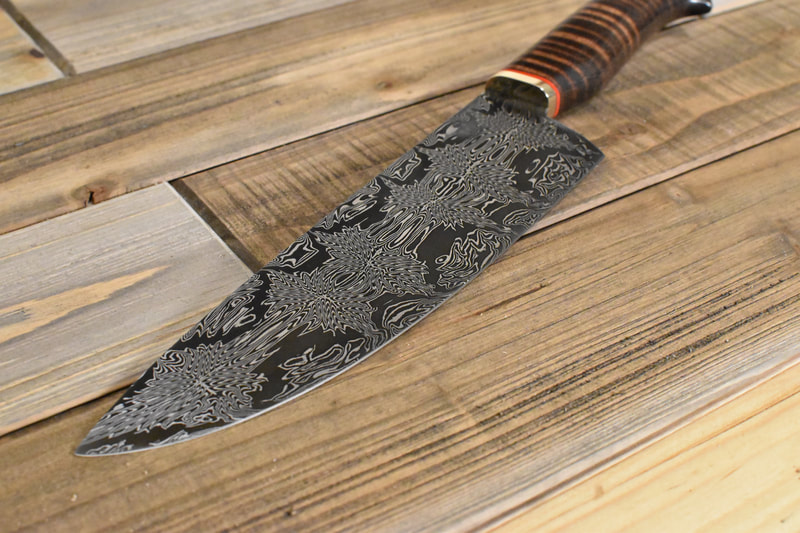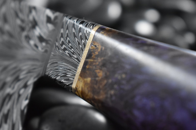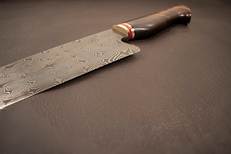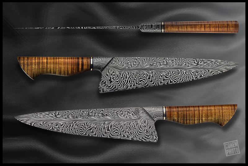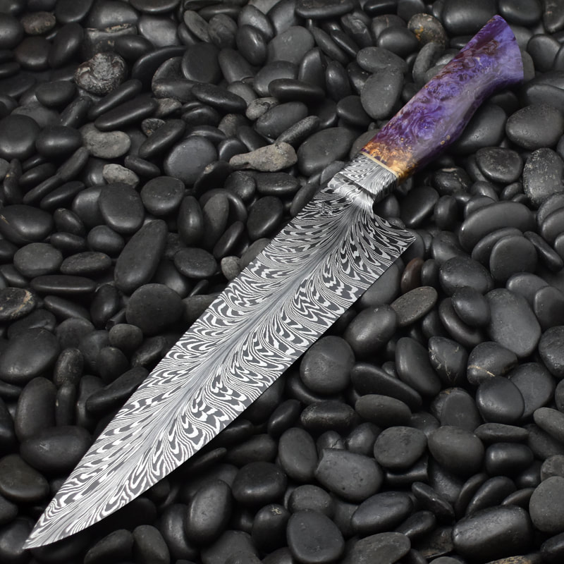 After BLADE show 2019, I wanted to expand my horizons even more, and I looked to something I never before attempted: chef knives. These knives were thinner than I had ever forged before, longer than my average knife, and more complex Damascus patterns than I ever attempted. I scraped my first several blades. The length and thinness tested my patience. and the long hours of forging complex Damascus proved demanding. In the end I finally broke into a new range of knives I had never made before, and the difficulty I experienced in the beginning made the success even sweeter.