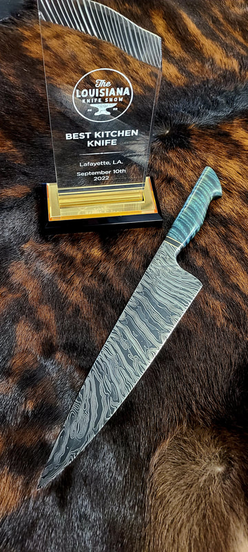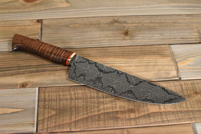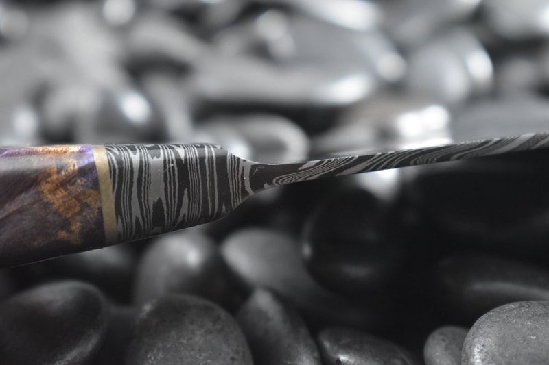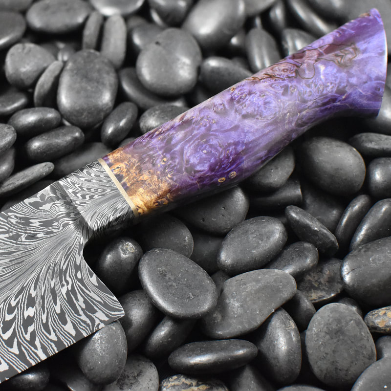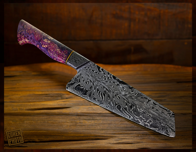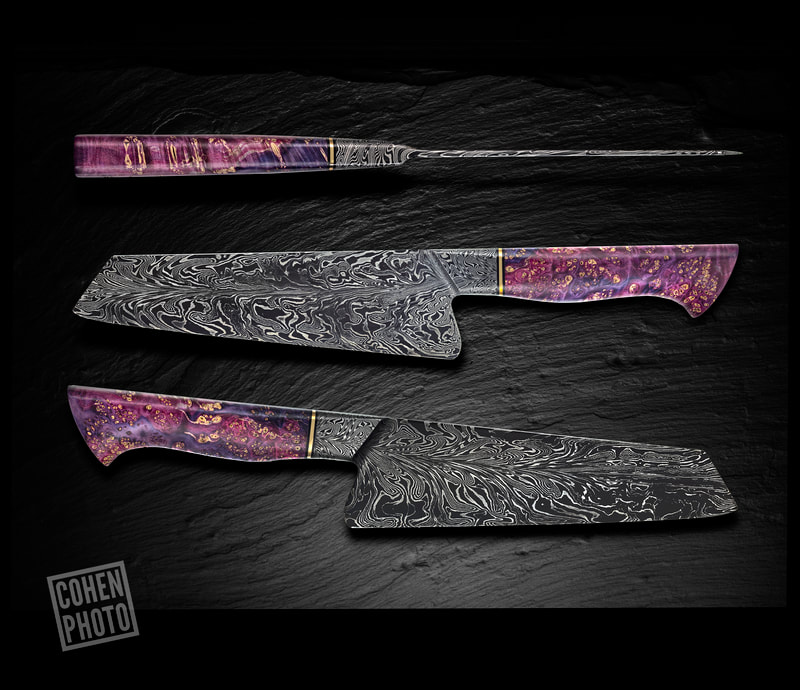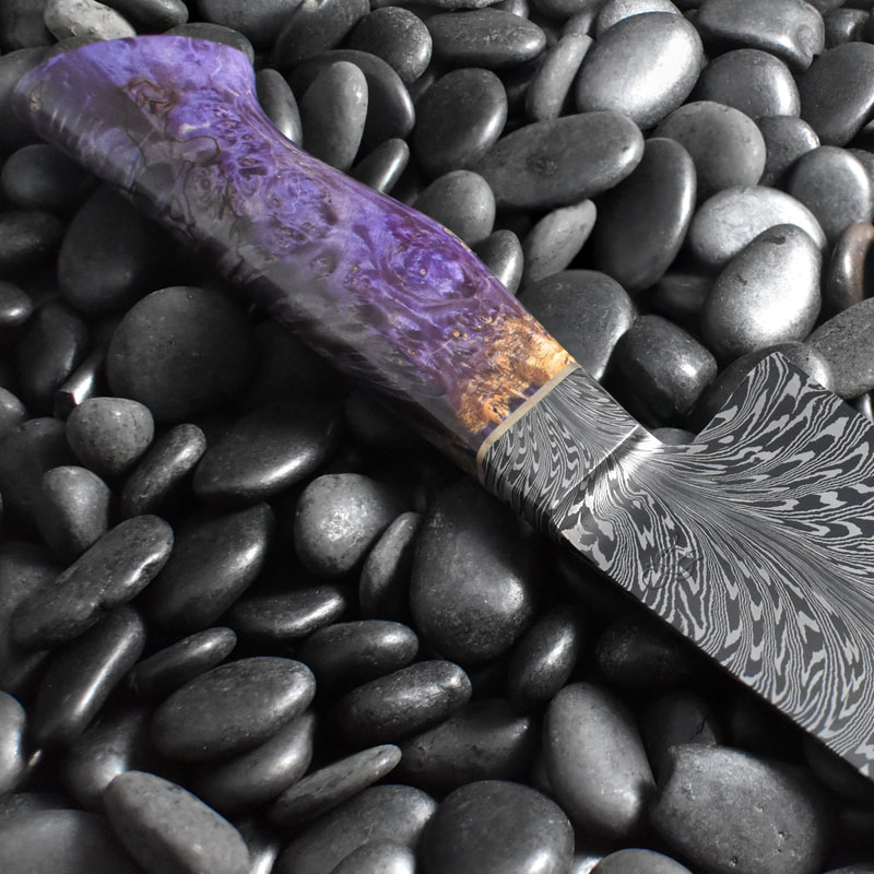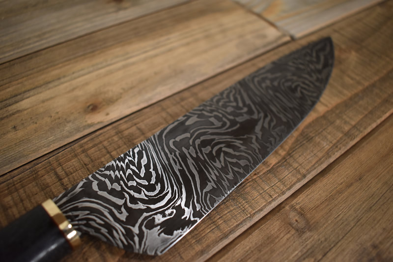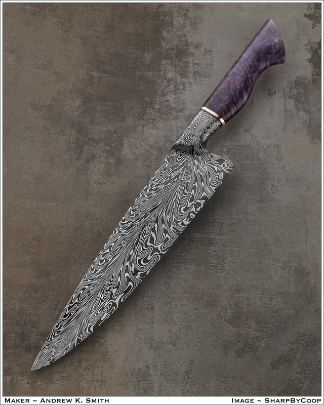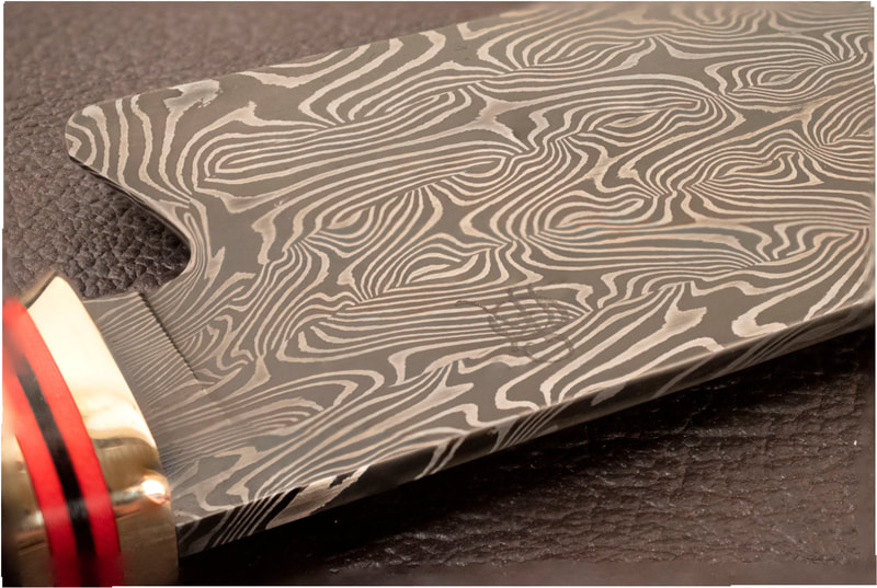 After BLADE show 2019, I wanted to expand my horizons even more, and I looked to something I never before attempted: chef knives. These knives were thinner than I had ever forged before, longer than my average knife, and more complex Damascus patterns than I ever attempted. I scraped my first several blades. The length and thinness tested my patience. and the long hours of forging complex Damascus proved demanding. In the end I finally broke into a new range of knives I had never made before, and the difficulty I experienced in the beginning made the success even sweeter.
