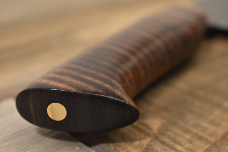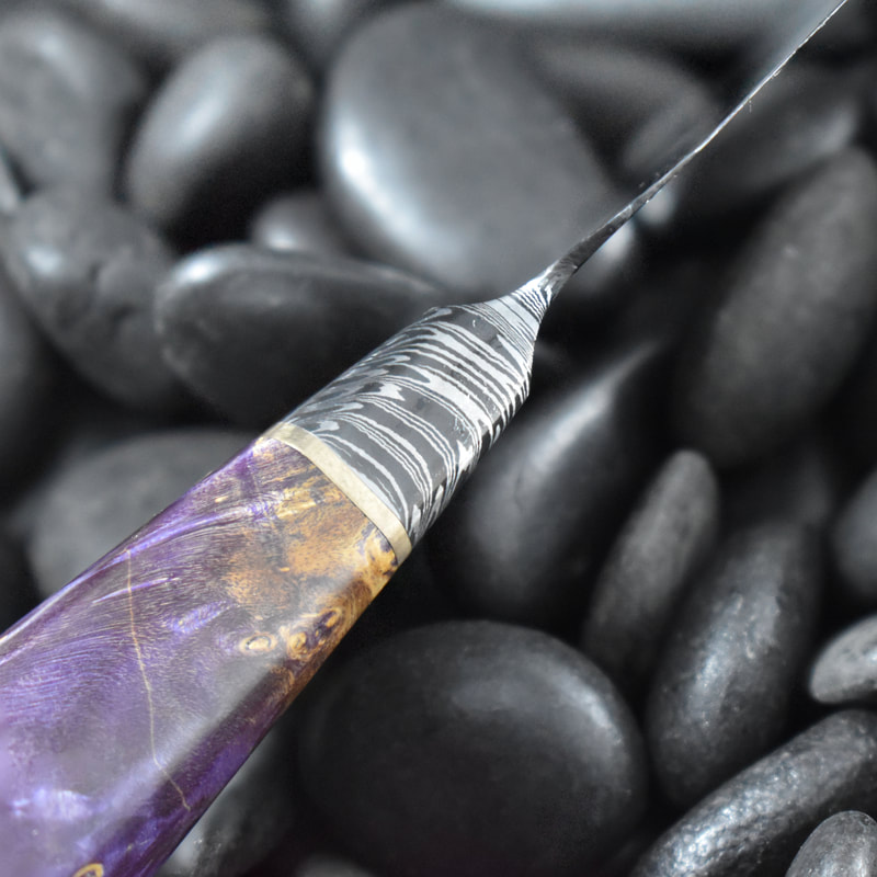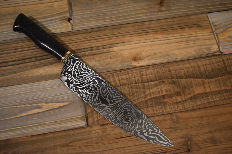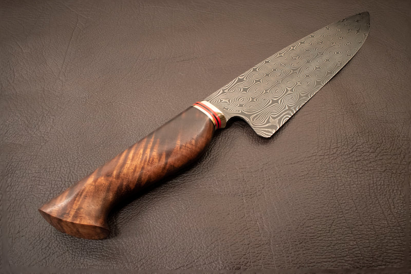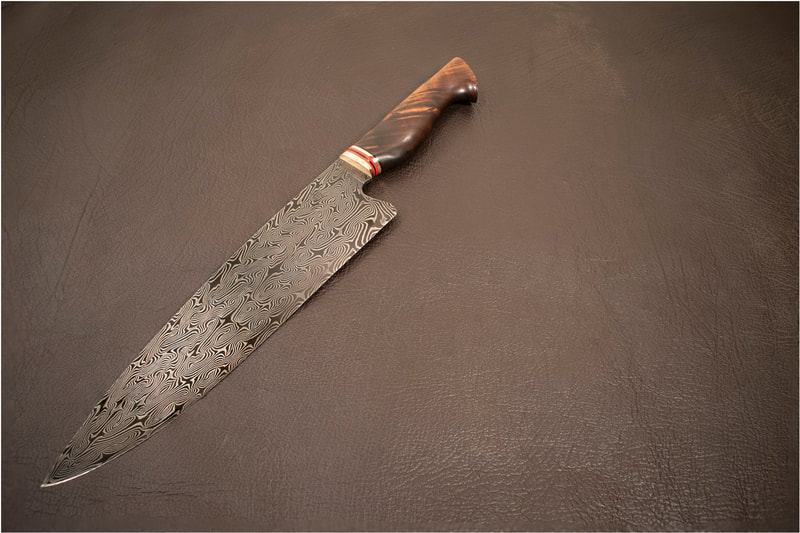 I still have many more styles I want to try but after finally getting my first chef knife under my belt, I am ready to try more. This page showcases all of my chef knives made to date. If you click on each image, it has a brief description of the materials used and, if Damascus, the pattern type and layer count.